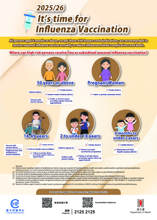 The SIV Programmes for the 2025/26 season have commenced this year, further covering persons aged 18 to 49 with chronic medical problems. Eligible persons can receive free or subsidised SIV under the programmes. The eligibility criteria and recommended vaccination venues are as follows: