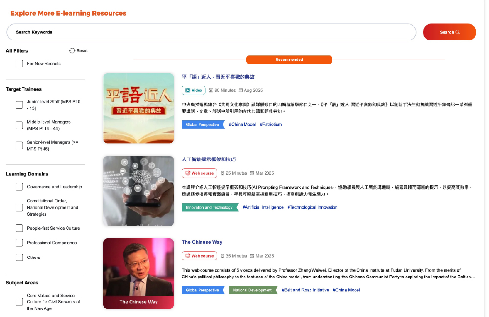 Resources on the LMP are systematically categorised, covering salient areas such as the Constitution, the Basic Law and National Security; the Country’s Latest Development; Core Values and Service Culture for Civil Servants of the New Age; Public Leadership and Management; International Perspectives and Collaboration; Innovation and Technology; and Languages and Communication, to meet the learning needs of staff at all levels.