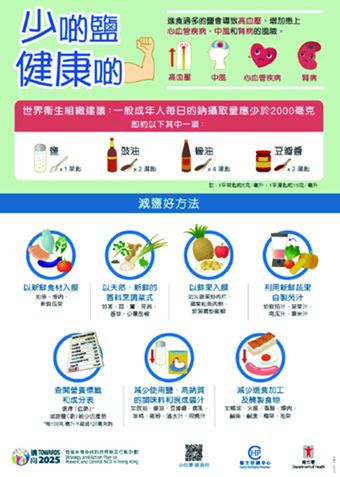 最後,購買預先包裝食品時,應仔細查閱營養標籤,選擇「低鹽」或「低鈉」產品(即每一百克或毫升不超過一百二十毫克鈉)。