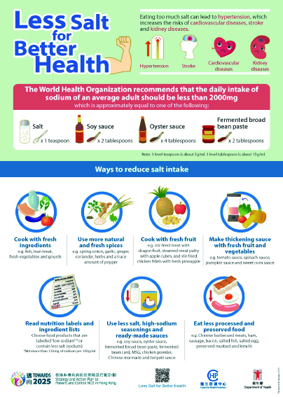 Lastly, when purchasing pre-packaged foods, you should read the nutrition labels carefully and choose food products that are labelled “low salt” or “low sodium” (i.e. containing not more than 120 milligrams of sodium per 100 grams or 100 millilitres).