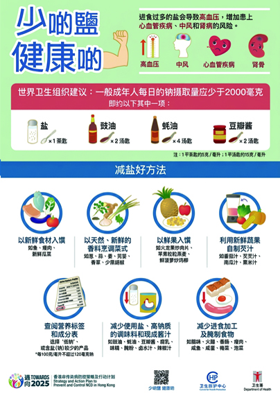 最后,购买预先包装食品时,应仔细查阅营养标签,选择「低盐」或「低钠」产品(即每一百克或毫升不超过一百二十毫克钠)。