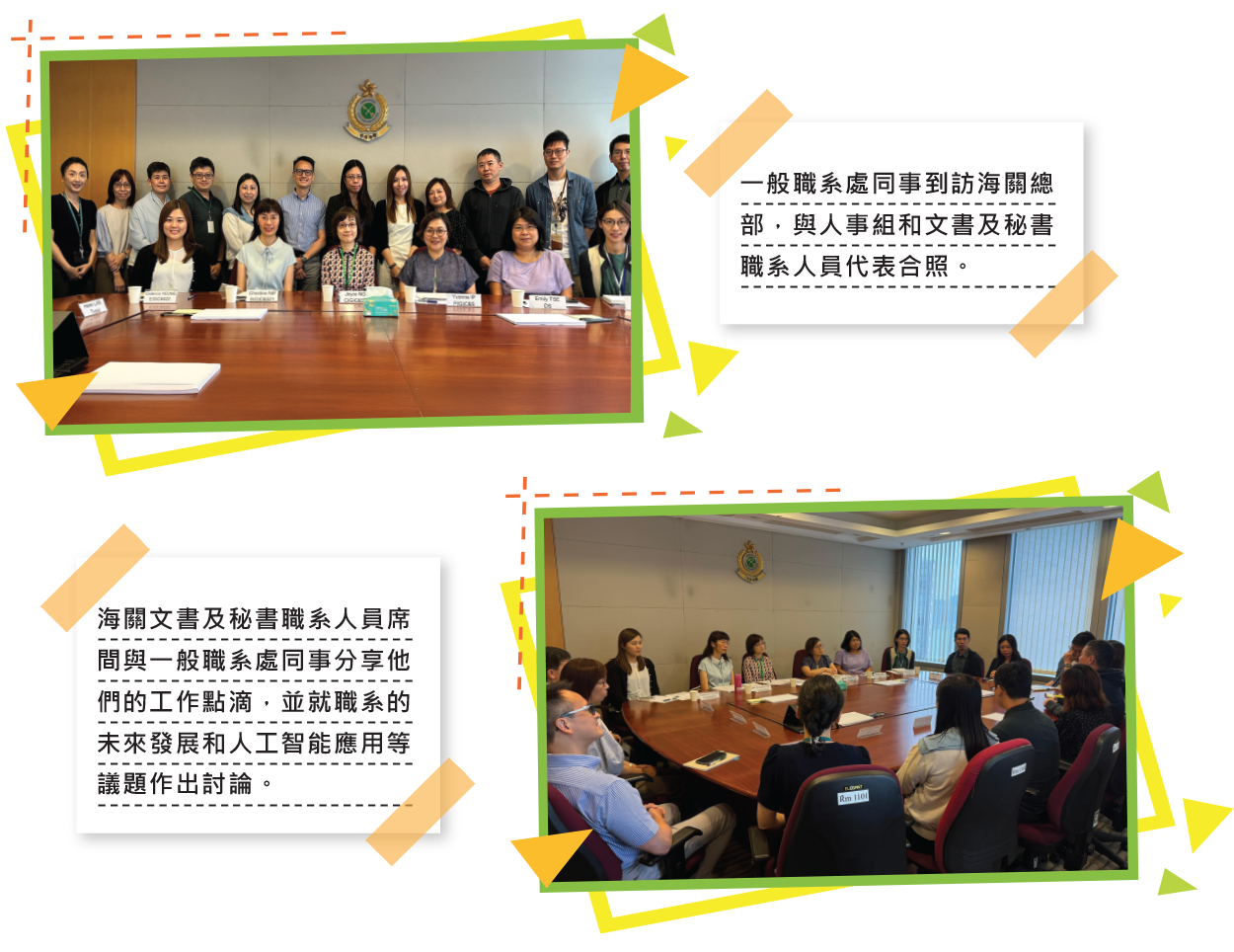 2025年6月13日,葉女士帶同一般職系處同事到訪香港海關(海關),與部門內務行政科同事和文書及秘書職系人員代表會面,並參觀海關應課稅品科轄下的顧客服務中心。在會面過程中,海關的文書及秘書職系人員代表分享他們的工作實況,除負責一般文書工作外,亦有機會協助執法人員處理相關職務,工作甚具挑戰性。此外,同事亦關注因應政府削減資源以及人工智能普及對職系未來發展的影響。