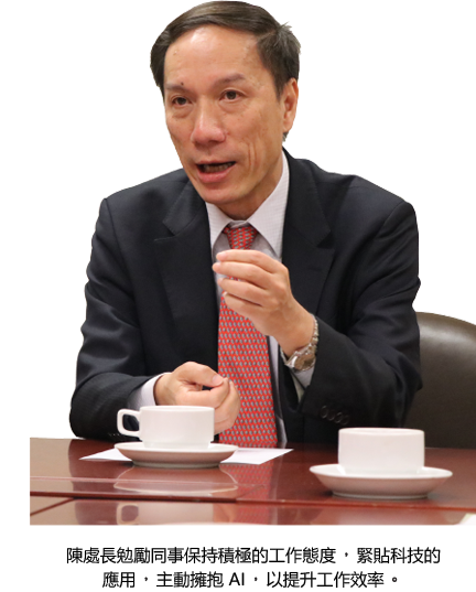 「當年沒人知道電腦會帶來什麼影響,但我們都清楚,不跟上就會落後。」陳處長說,這次變革讓他深信,科技從不是「威脅」,而是提升效率的「工具」。只要主動擁抱,學會運用,就能提升自己的價值。他特別提到,從前寫作能力的高低限制了許多人在工作中的發展,但隨着 AI 語言技術不斷進化,文書及秘書職系同事只要善用 AI,即可藉科技大幅提升寫作能力,從而提高個人的競爭力。
