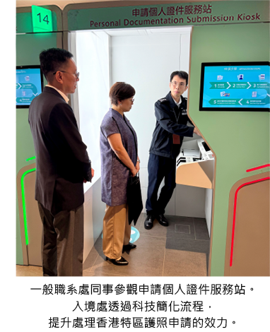 通過這次探訪,讓我們更深入了解入境處在多方面推動電子服務的成果 : 為市民提供更便捷的公共服務之餘,也大大減輕了文書及秘書職系同事的工作量。收發小組同事指出,入境處近年積極推行網上服務,有效降低了處理紙本文件的需求。此外,外籍家庭傭工組的同事提到,越來越多市民使用網上繳費服務,排隊人流和等候時間也顯著縮減。