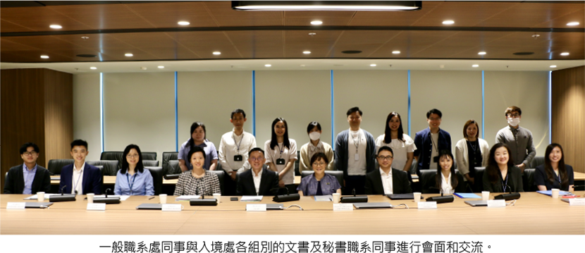 2025年9月10日,前任首席行政主任(一般職系)文書及秘書葉敏儀女士帶同一般職系處同事到訪入境事務處(入境處)總部。團隊先參觀將軍澳婚姻登記處,由文書職系同事講解在婚姻登記儀式前的準備工作。其後,部門管理科轄下收發小組同事介紹他們的日常工作,以及分享他們處理突發事件的經驗,包括黑色暴雨警報解除後,如何在半小時內重開收發櫃枱,務求盡快處理大量郵件及恢復服務。旅行證件及國籍(申請)組的文書職系同事接着介紹在處理證件及國籍申請上不同崗位的工作。最後,葉女士與入境處各組別同事進行會面和交流,分享文書及秘書職系的發展概況。